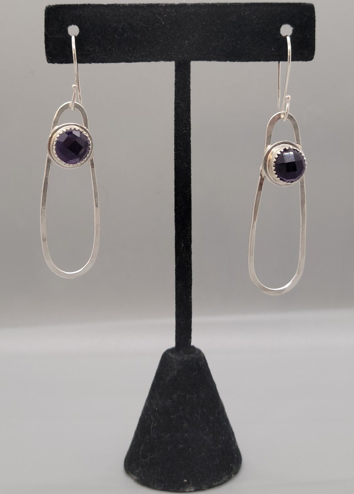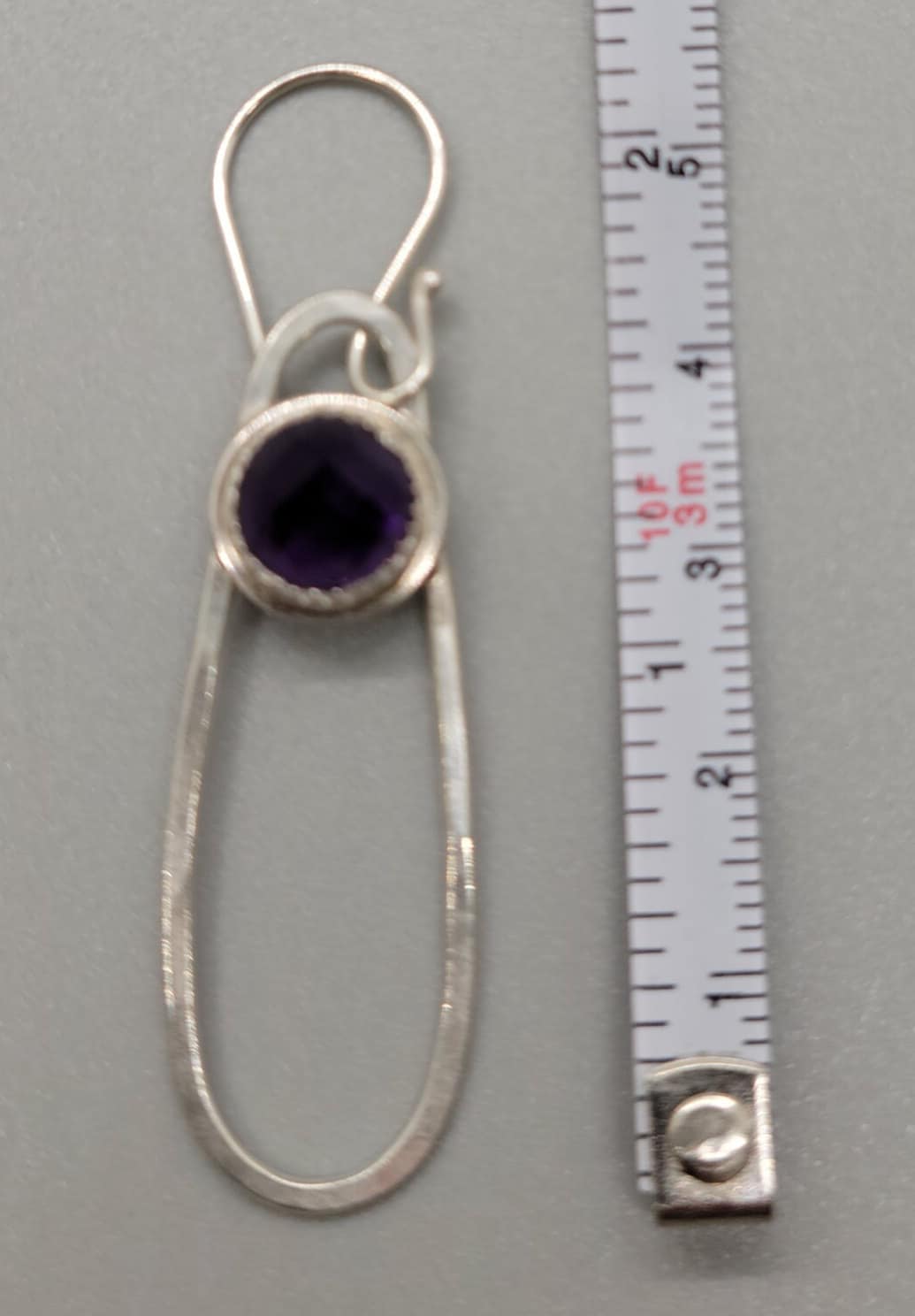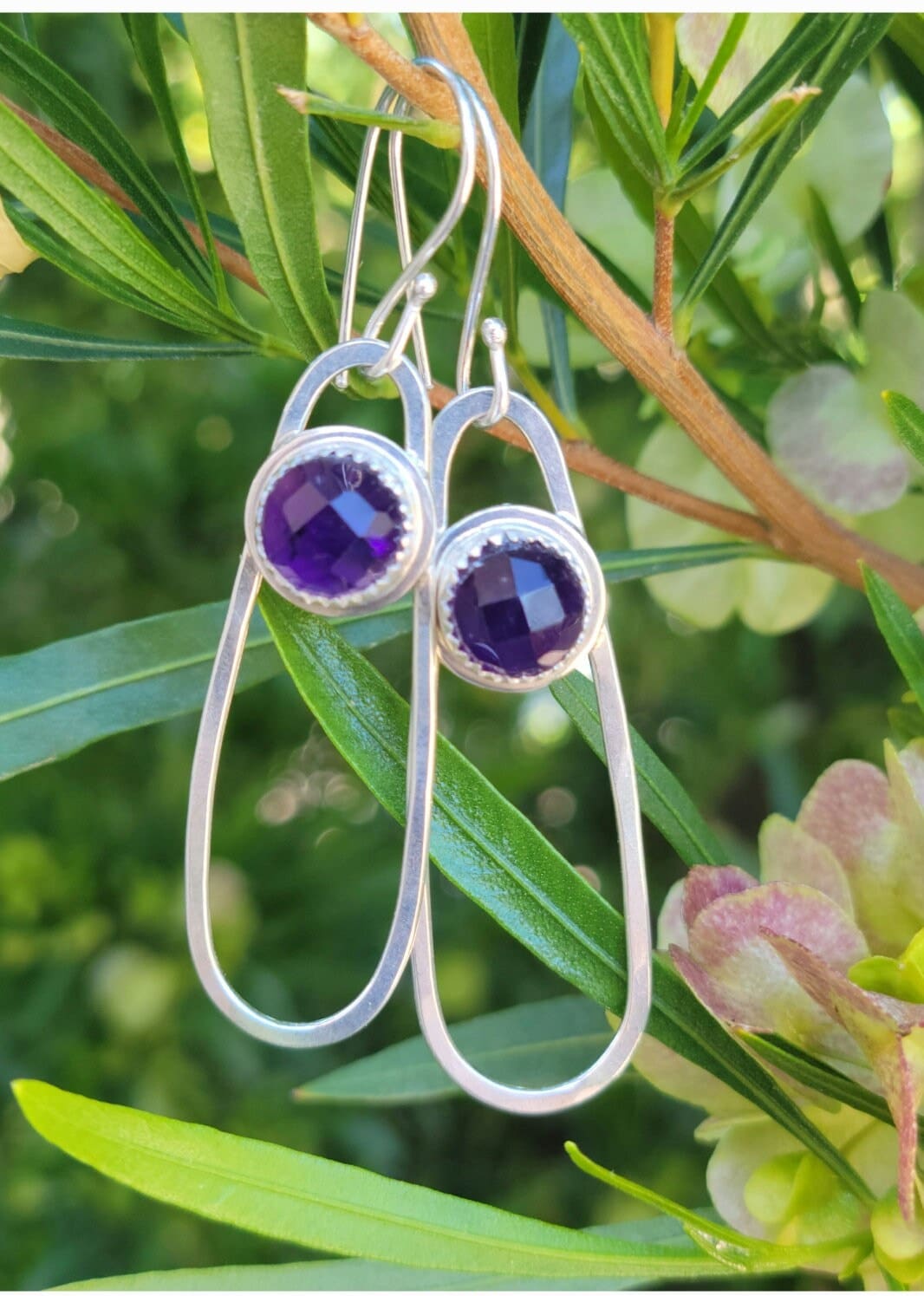 Amethyst drop earrings on sterling silver. Amethyst stones are 8mm circles set in serrated edge bezel. Amethyst is said to have the metaphysical properties of Protection, concentration and confidence.