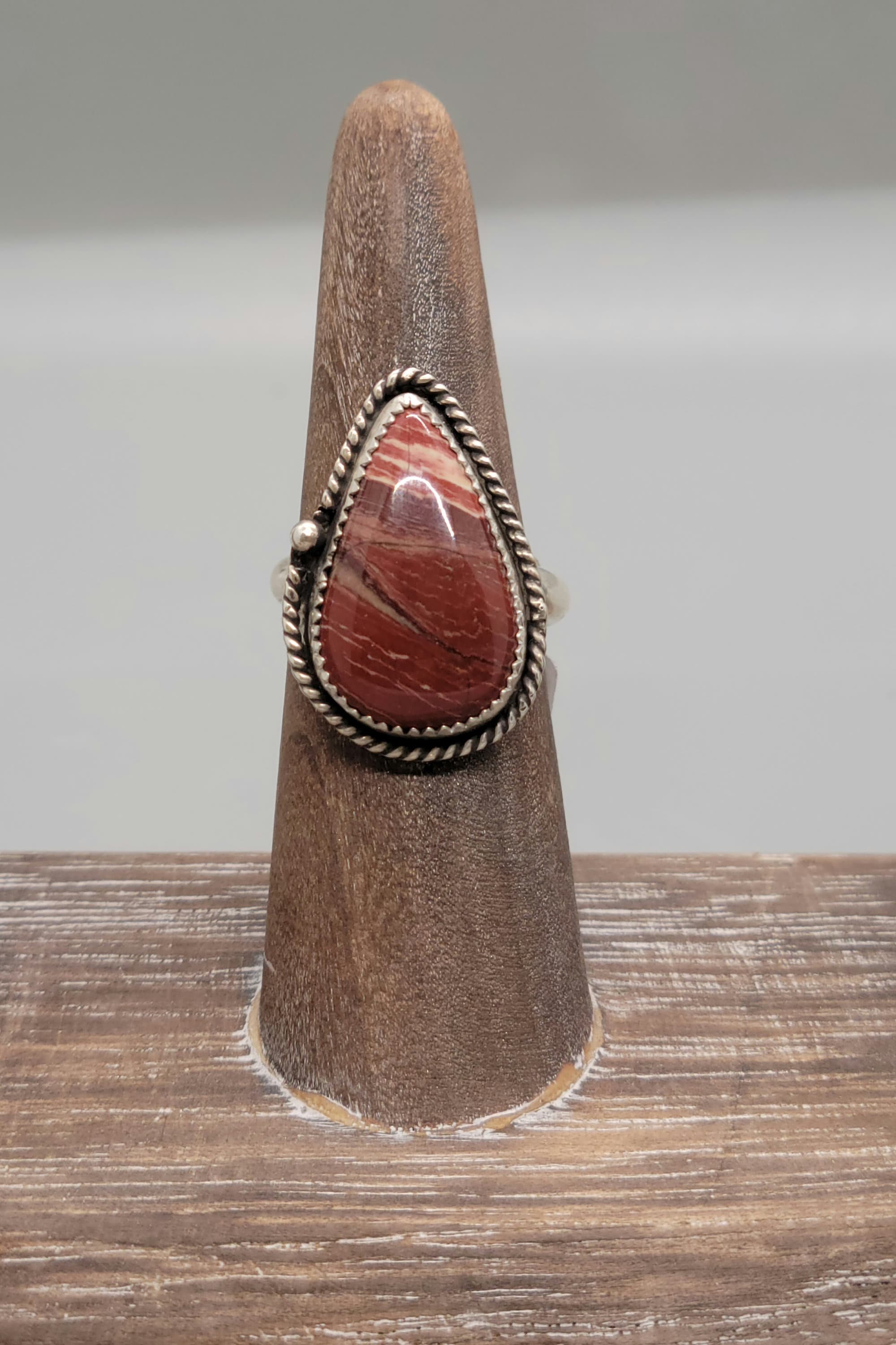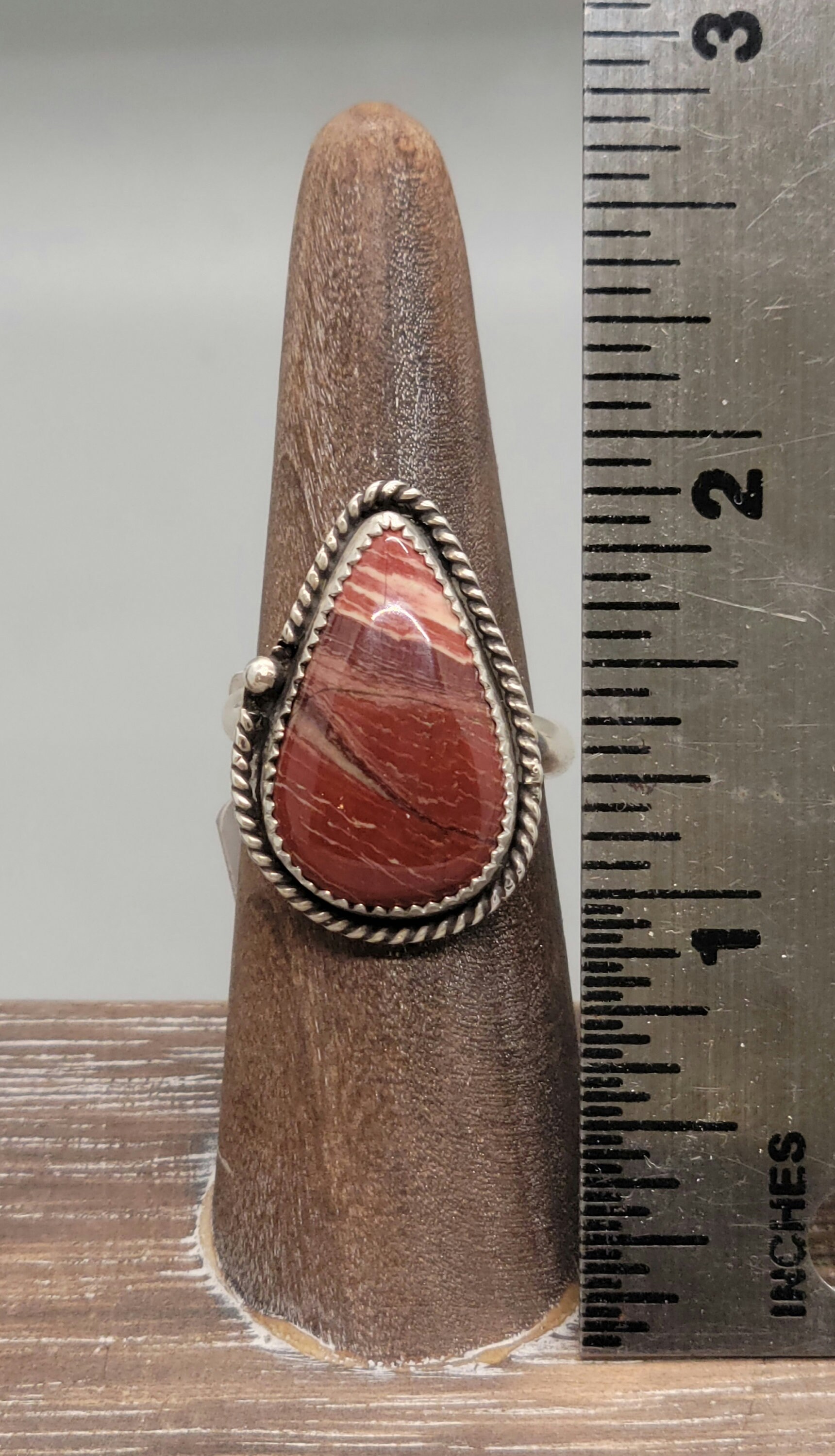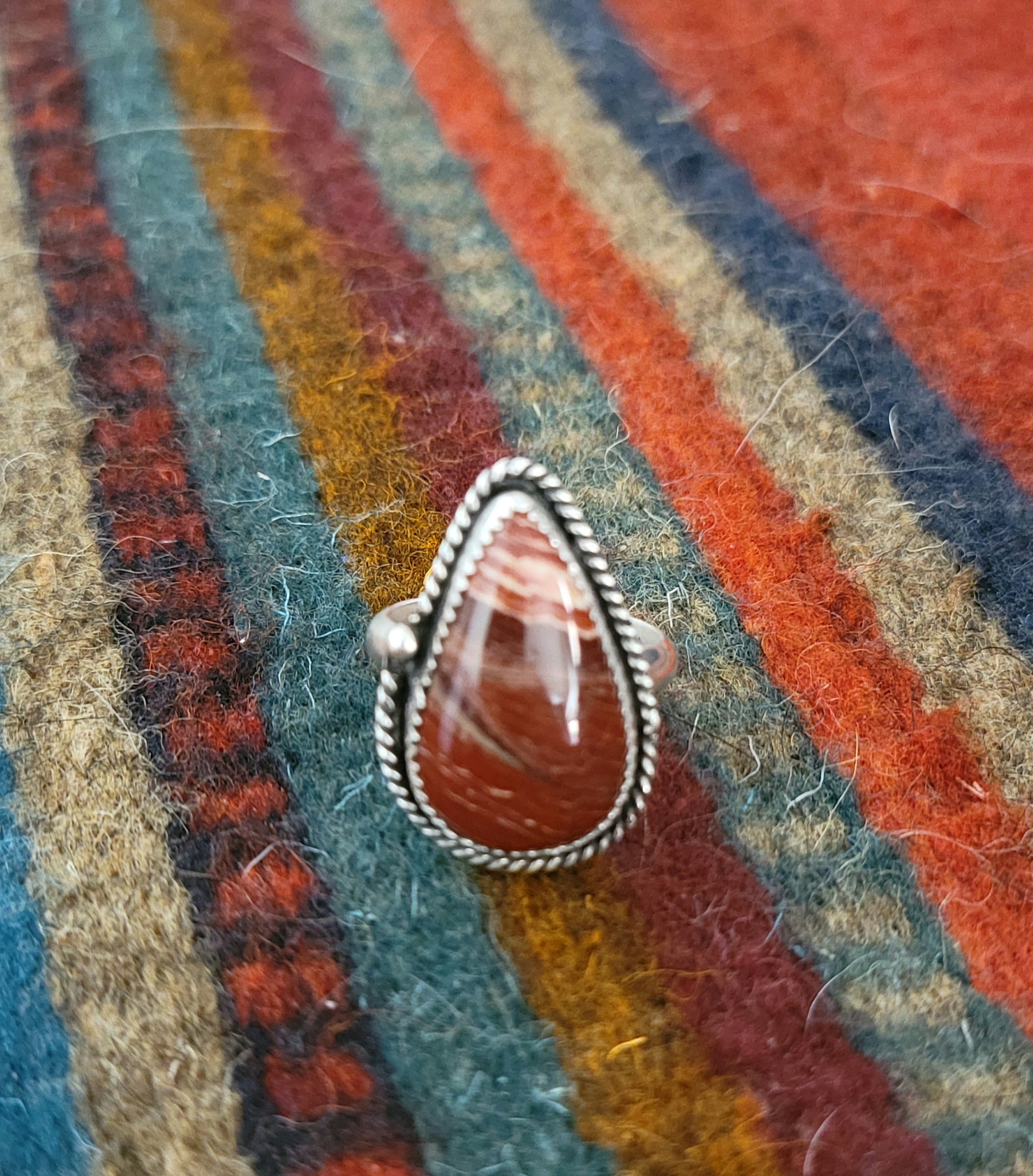 Red jasper embellished sterling silver ring on single half round band, size 7
