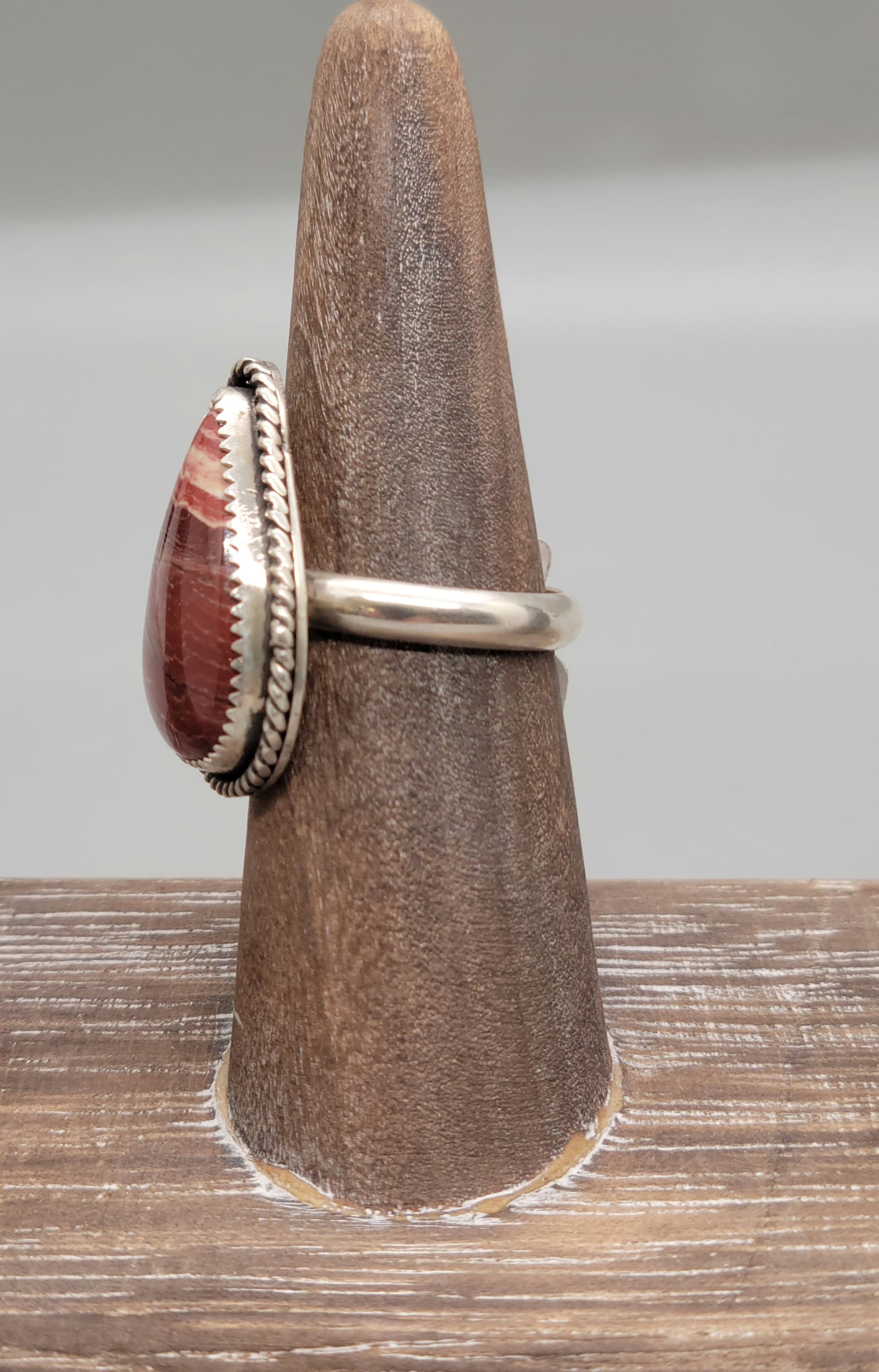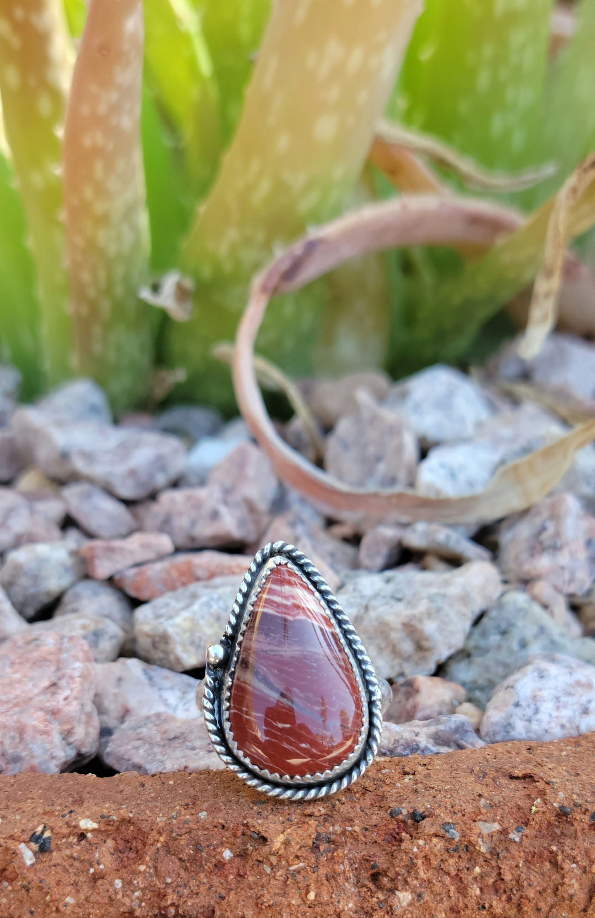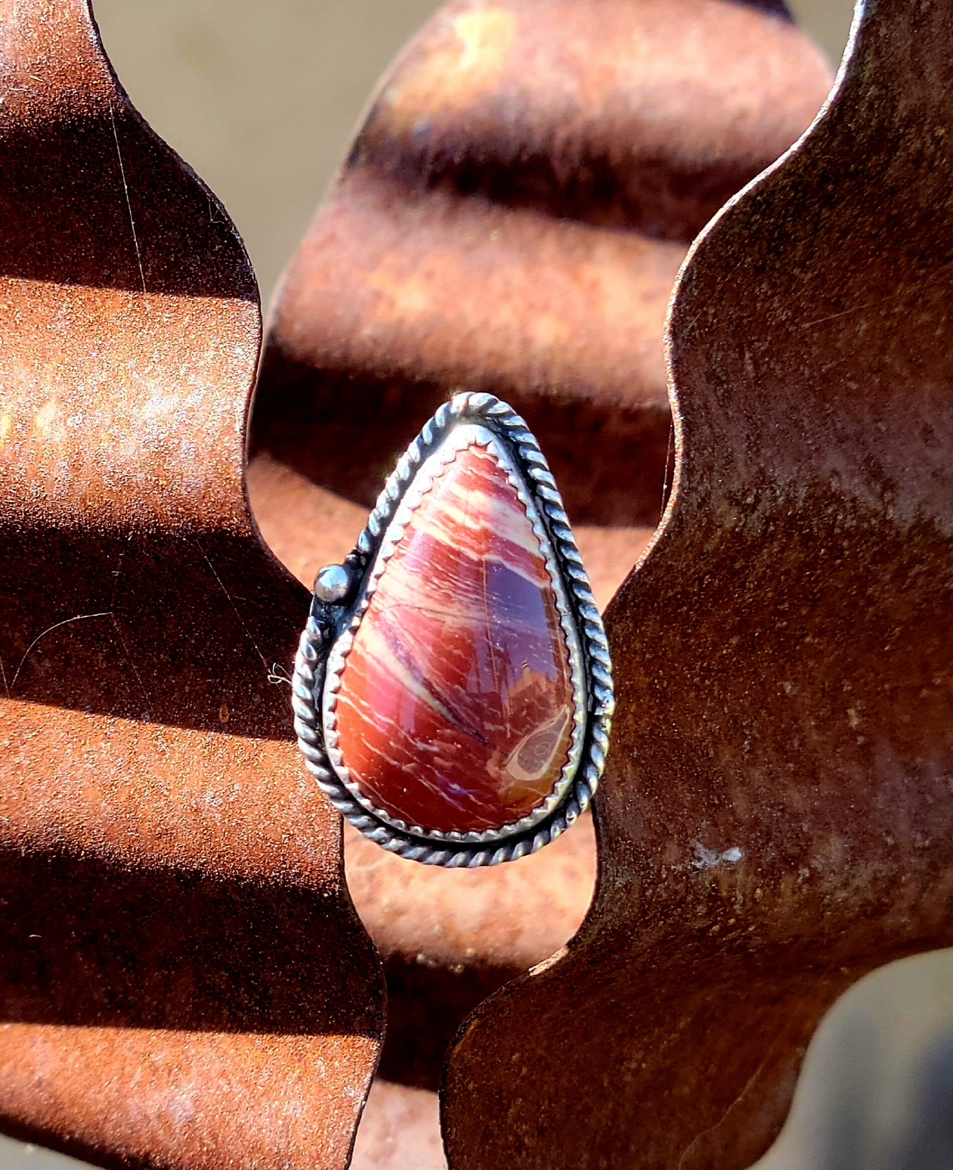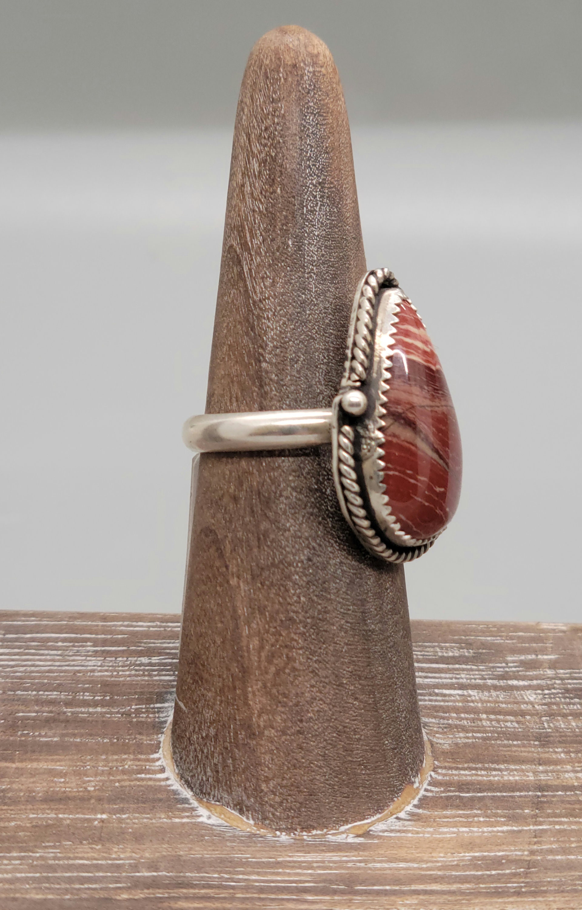 Red jasper embellished sterling silver ring on single half round band, size 7