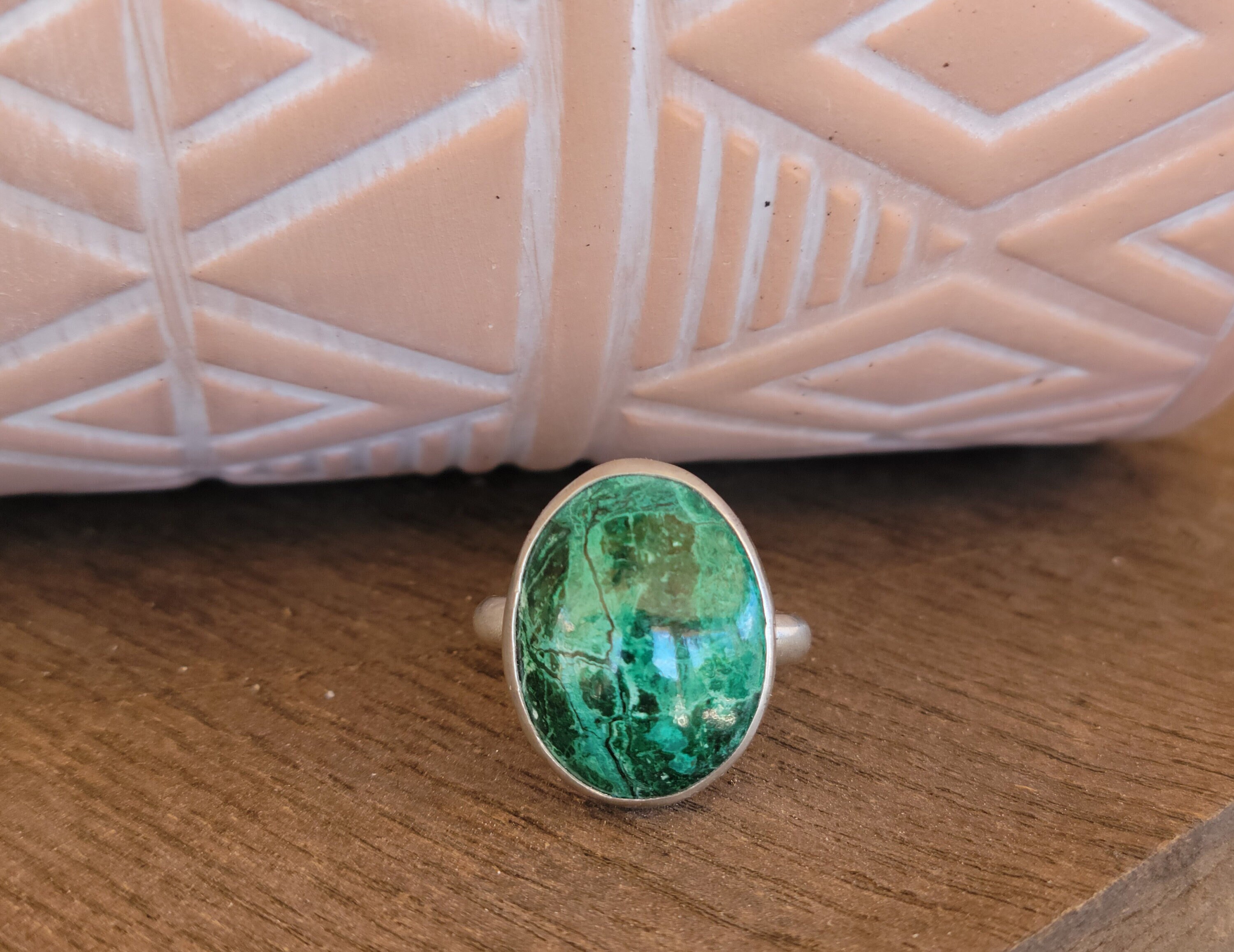 Single Malachite oval (13/16" x 1/2") smooth cut stone set in sterling silver with single half round band. All hand made. Malachite metaphysical properties of Harmony, relationships, strength, growth & Love.