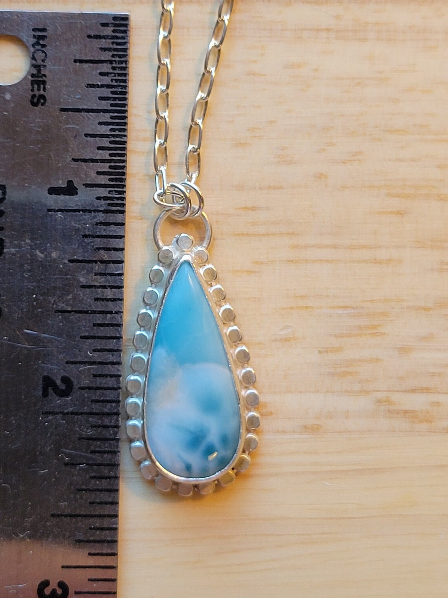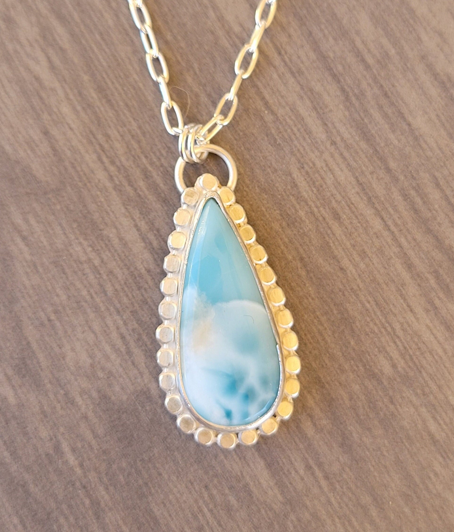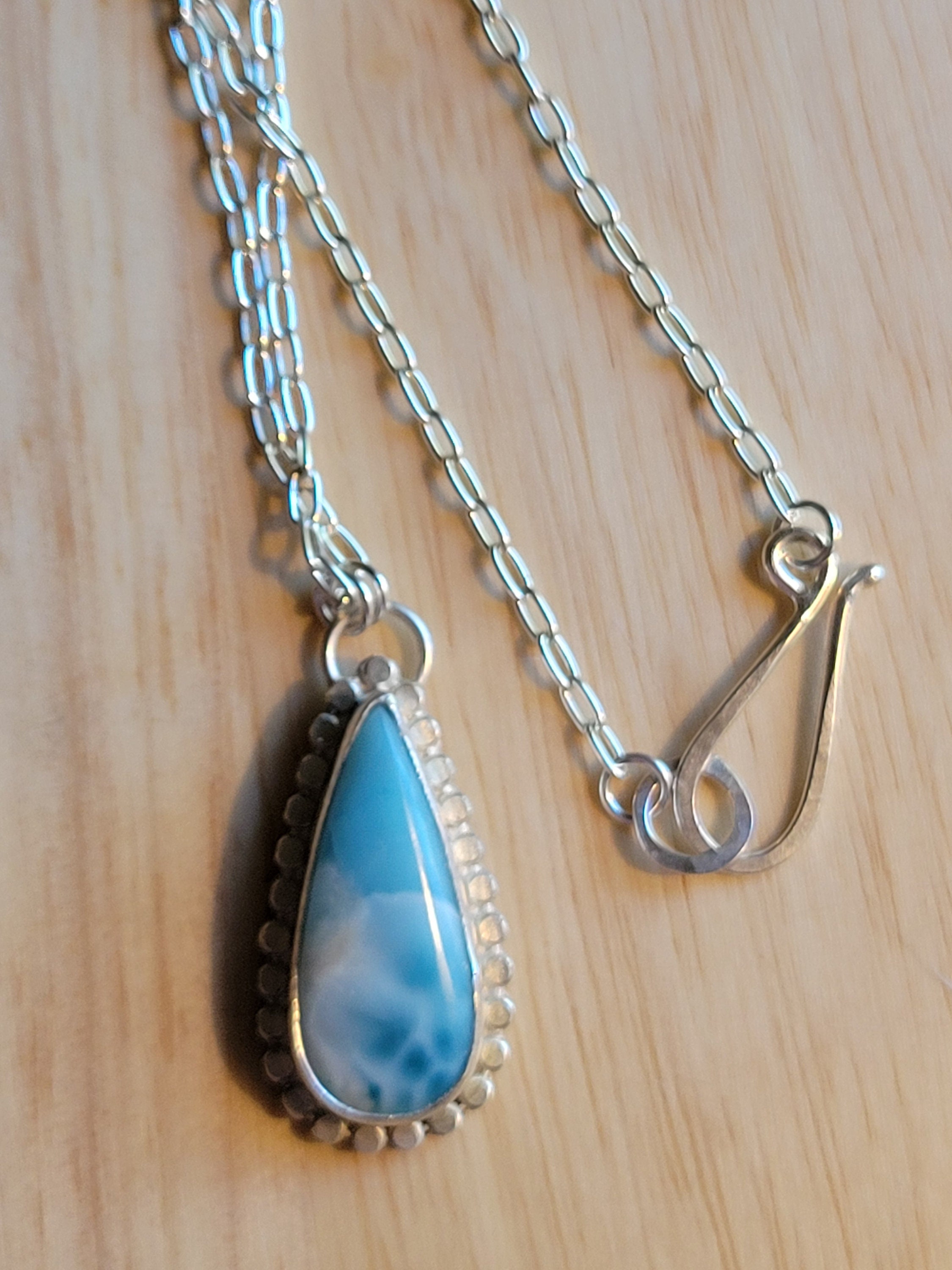 Larimar teardrop pendant on 18" sterling silver chain with handmade clasp.