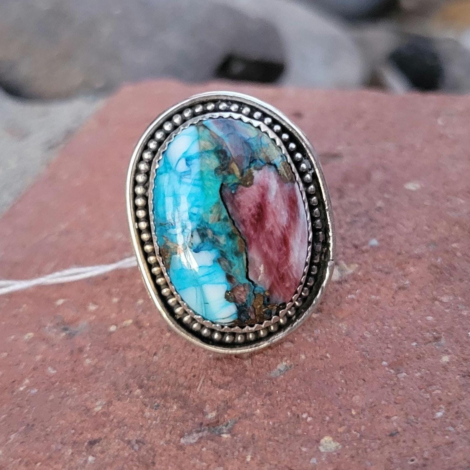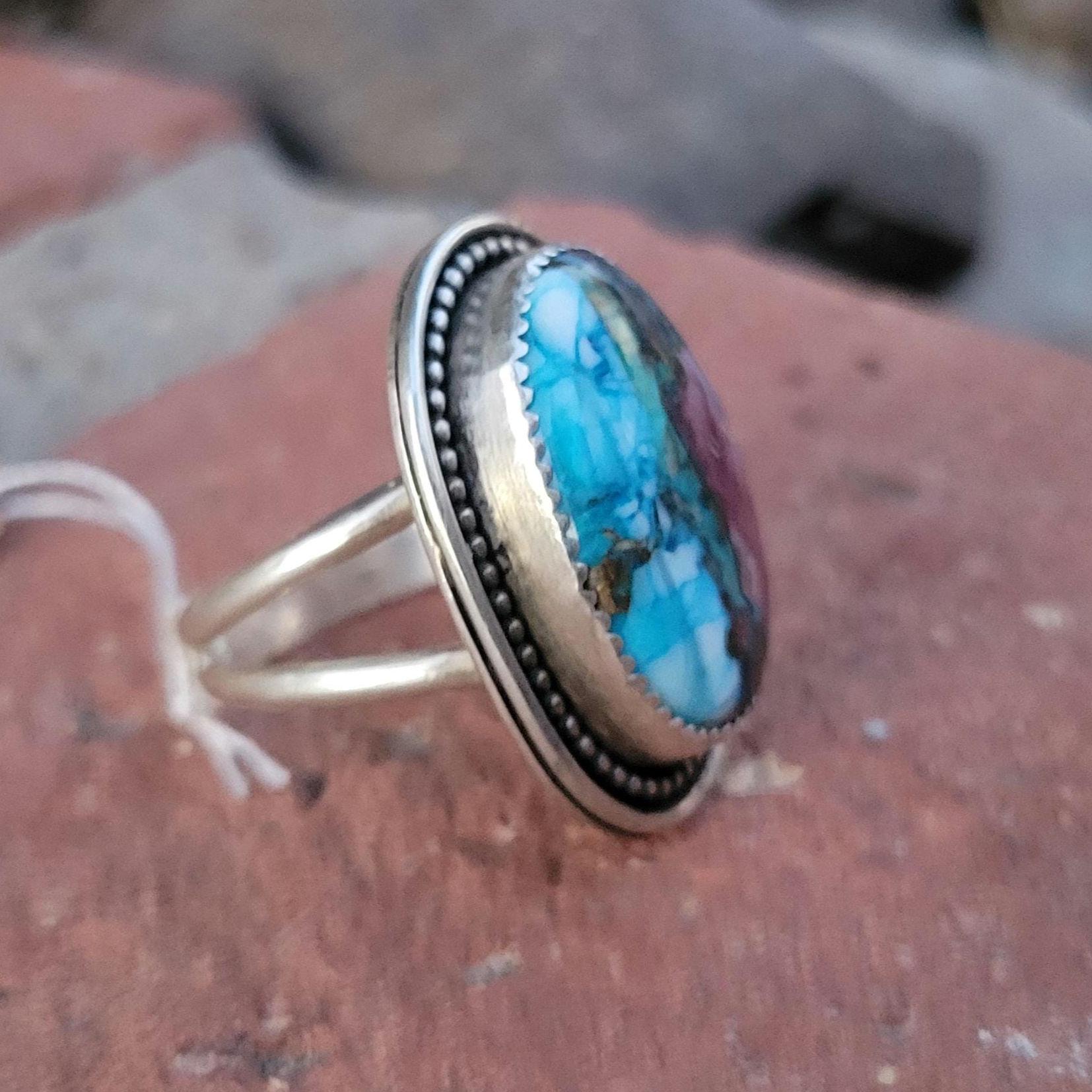 Mojave Turquoise sterling silver statement ring with double half round band, size 8 1/2.
