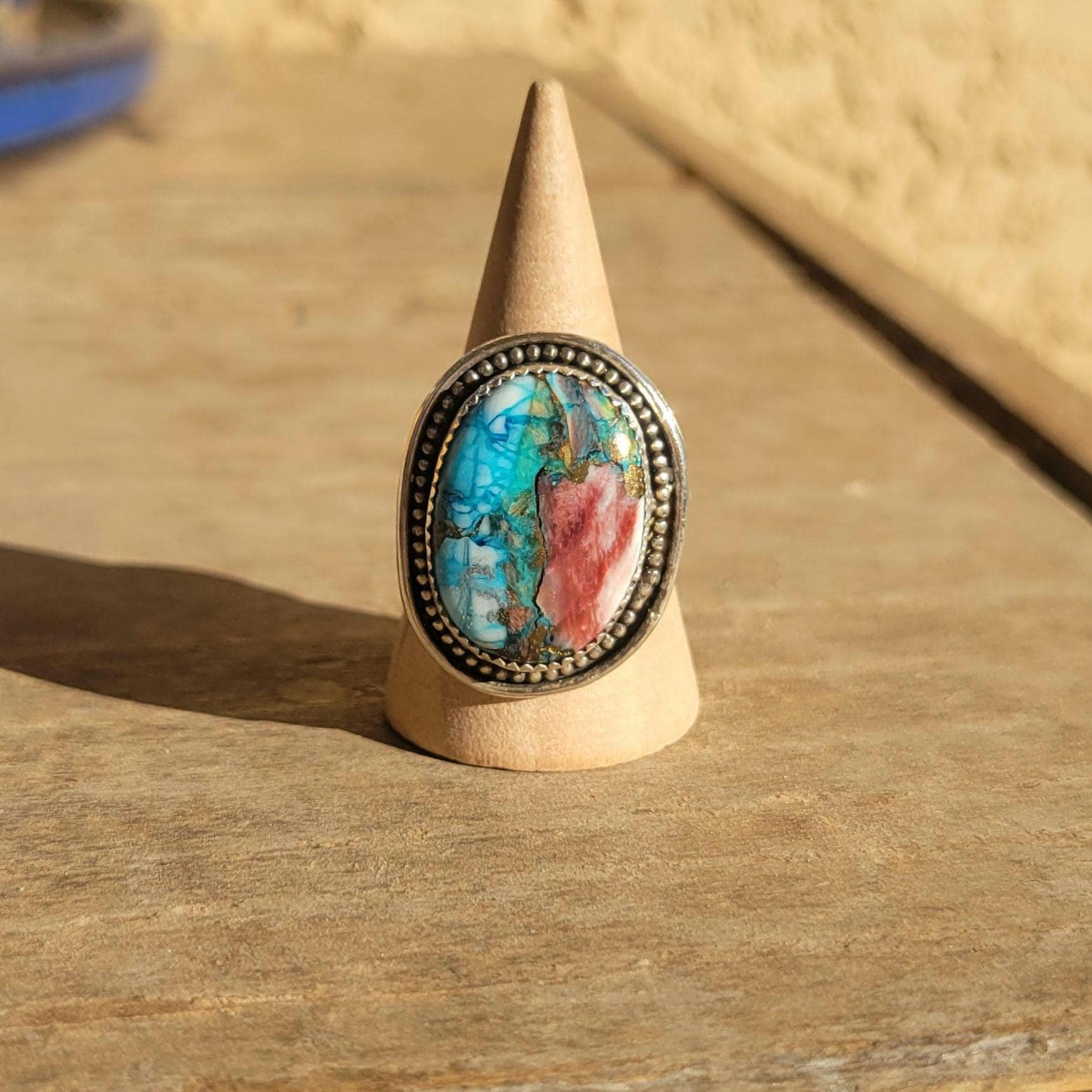 Mojave Turquoise statement ring with beadwire accent in sterling silver, with double half round band, size 8 1/2.
