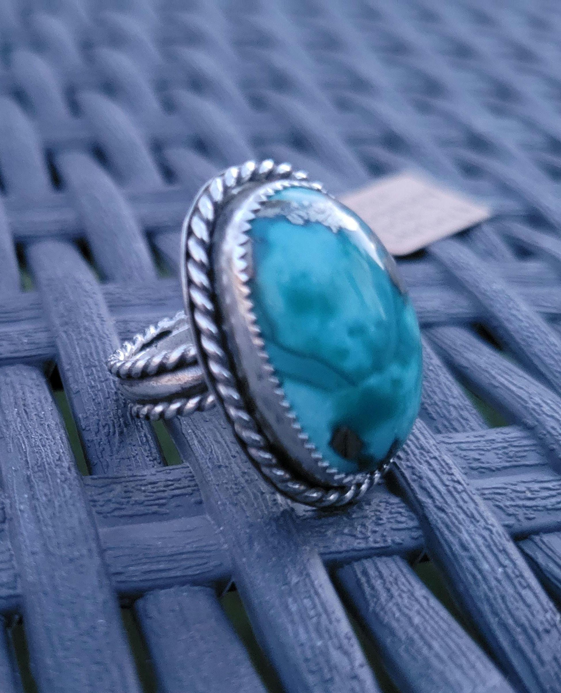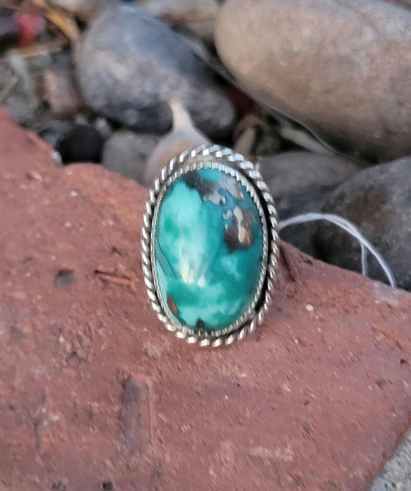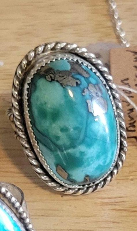 Peruvian Turquoise with Pyrite, large oval stone statement ring, with substantial band size 6