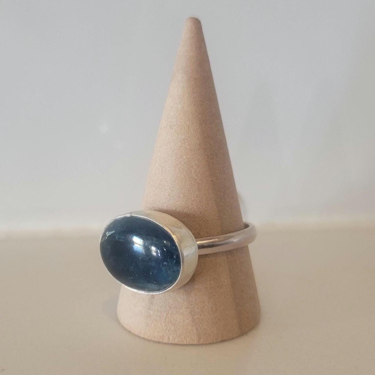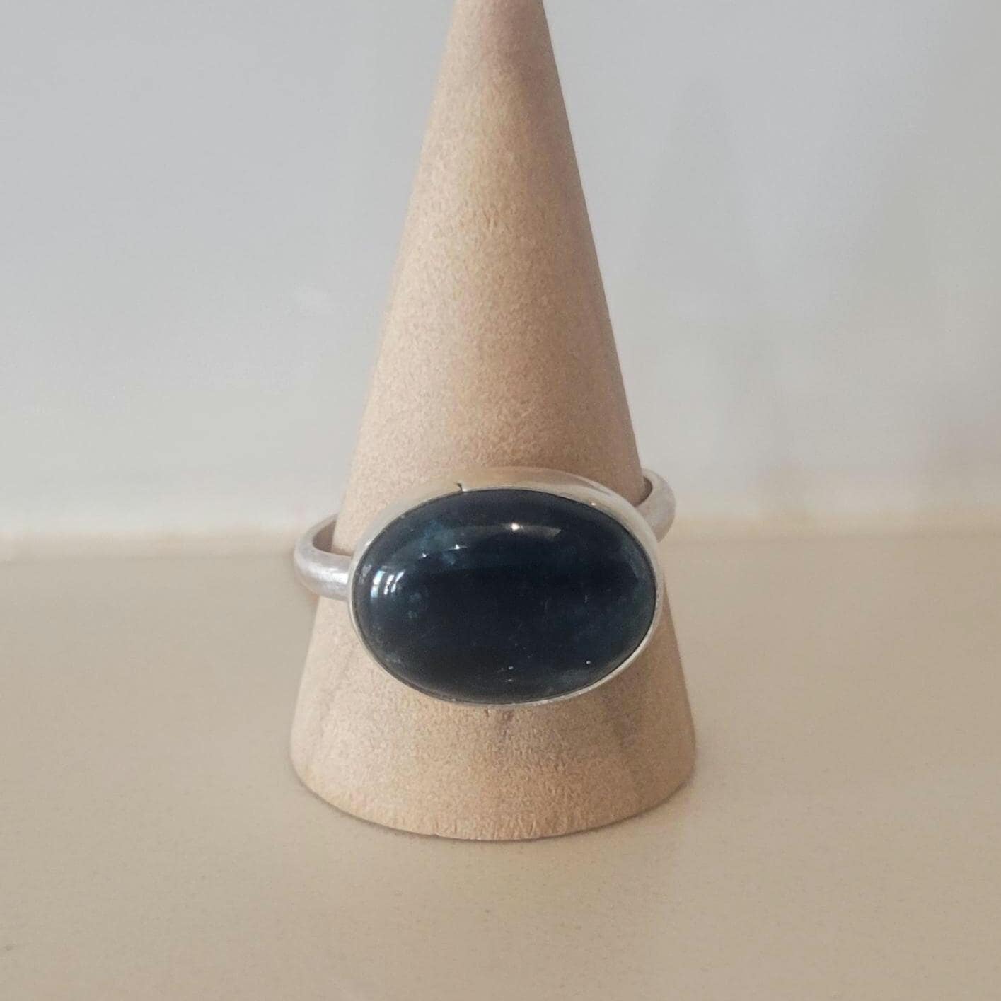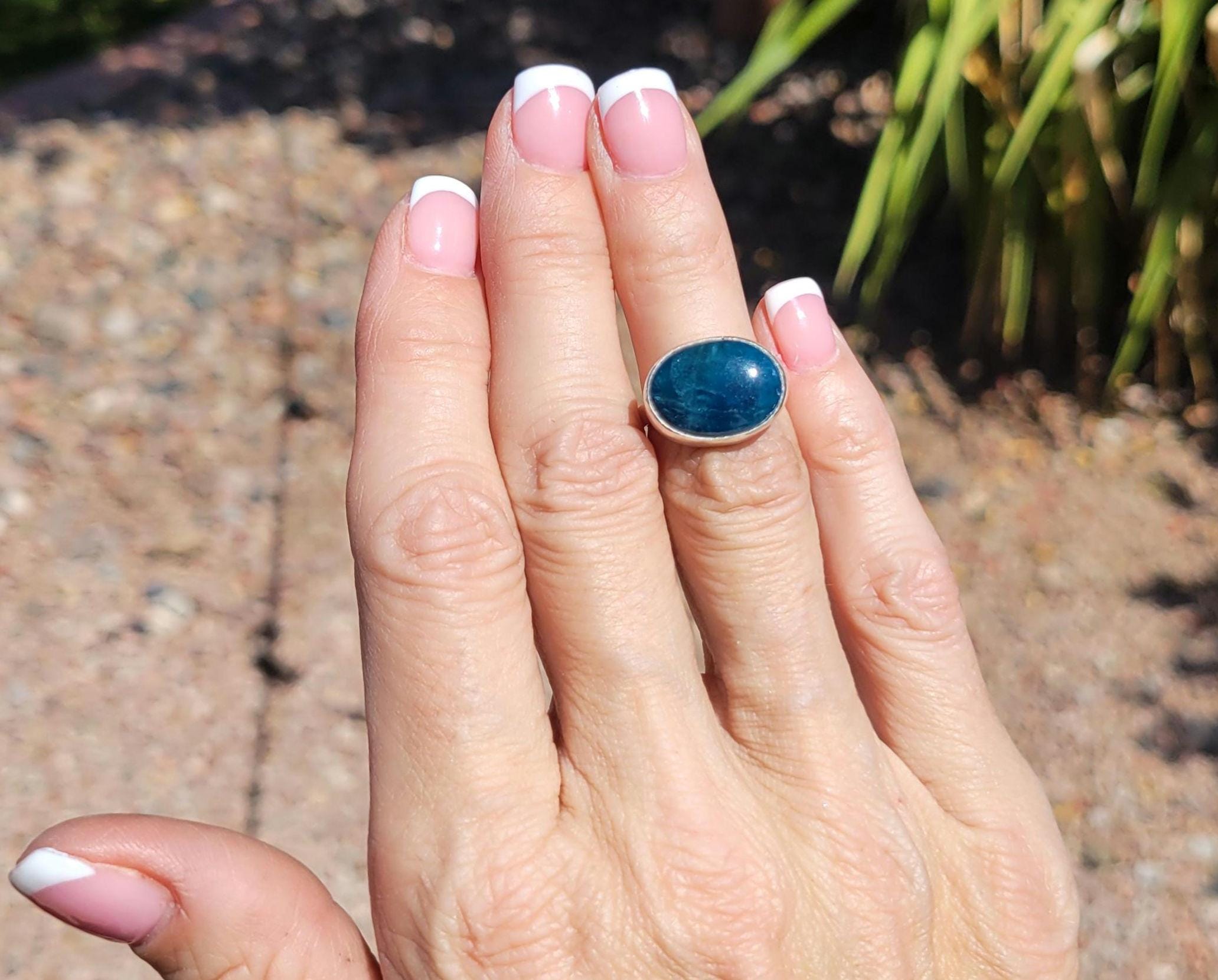 Apatite oval (10 x 14) set horizontal in sterling silver on a single half round band, size 5.5
