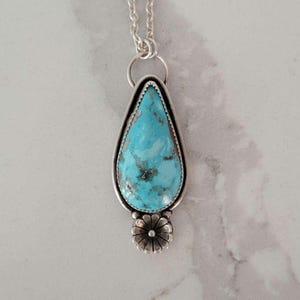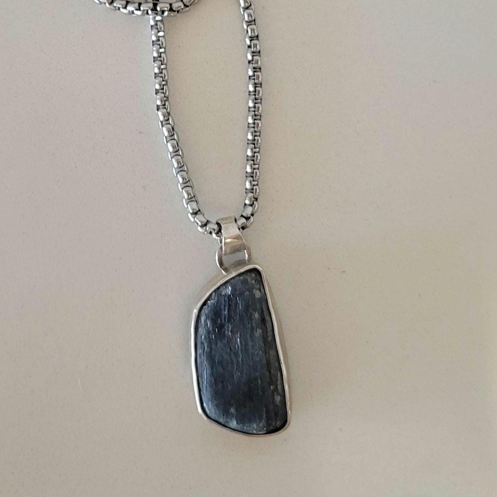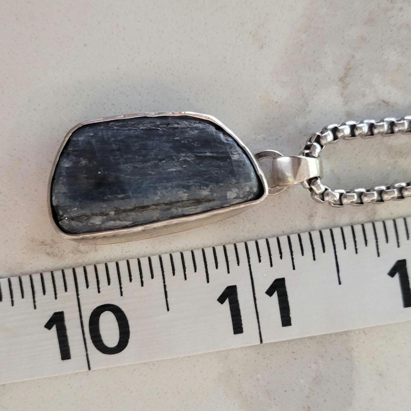 Blue Kyanite free form stone set in sterling silver setting and bail. Chain and clasp are not sterling silver, chain length is 23".