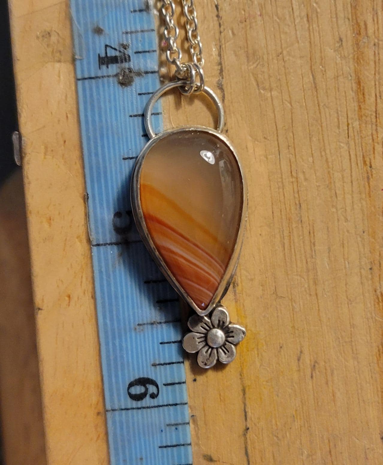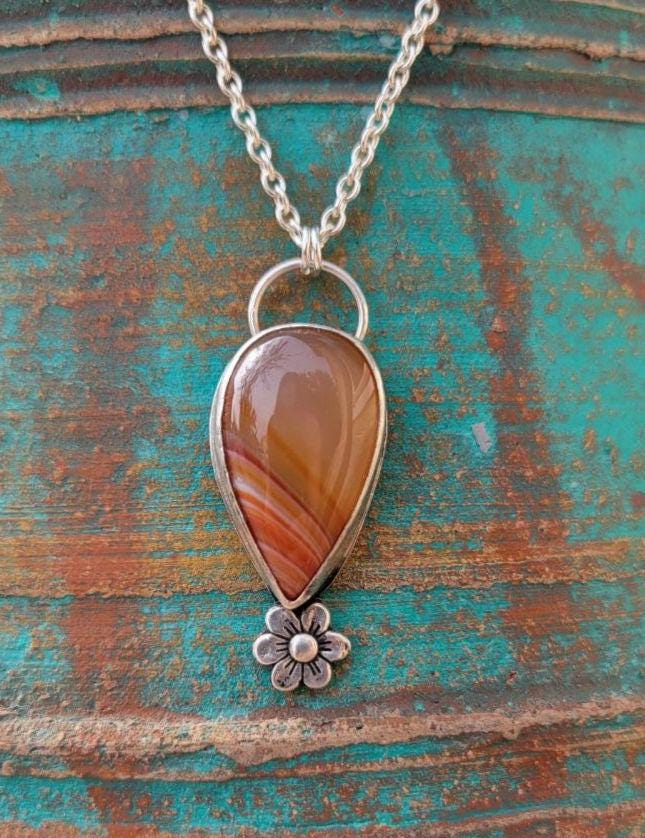 Orange Agate tear shaped stone with floral accent all sterling silver with a handmade clasp.