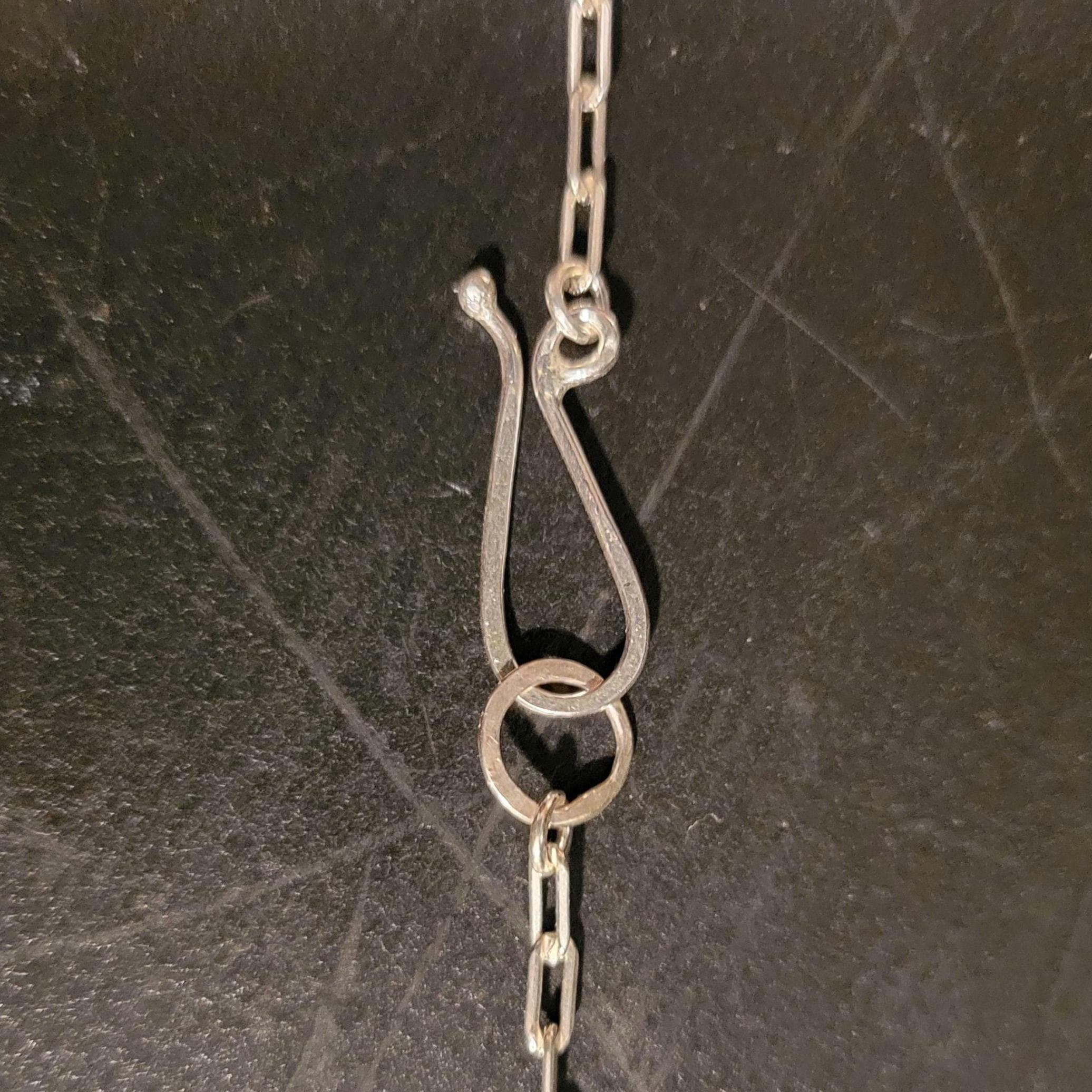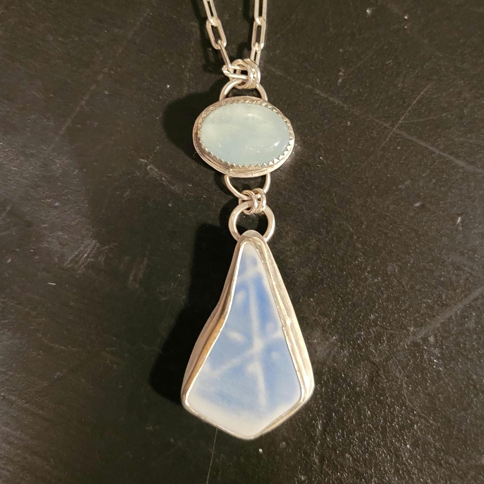 Aquamarine &sea pottery pendant with sterling silver setting, chain & handmade clasp. Chain is an 18" paperclip style.