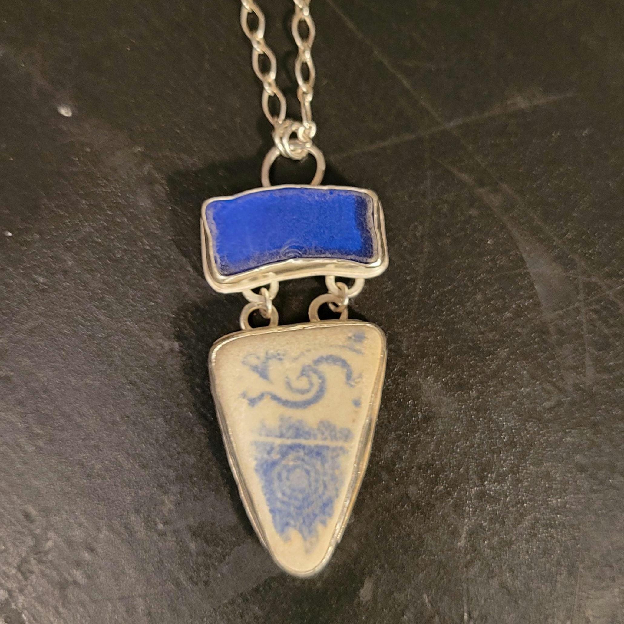 Cobalt Seaglass & sea pottery pendant with sterling silver setting, chain & handmade clasp. Chain has 16" or 18" clasp option.