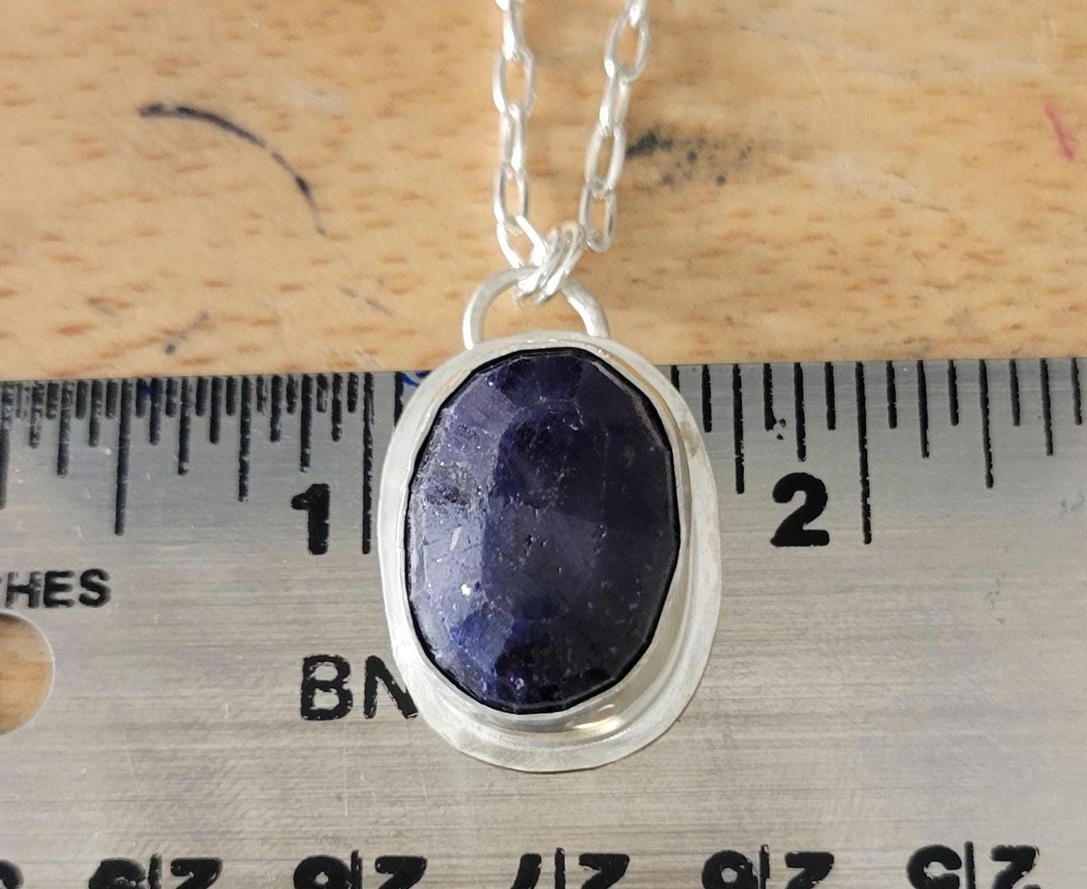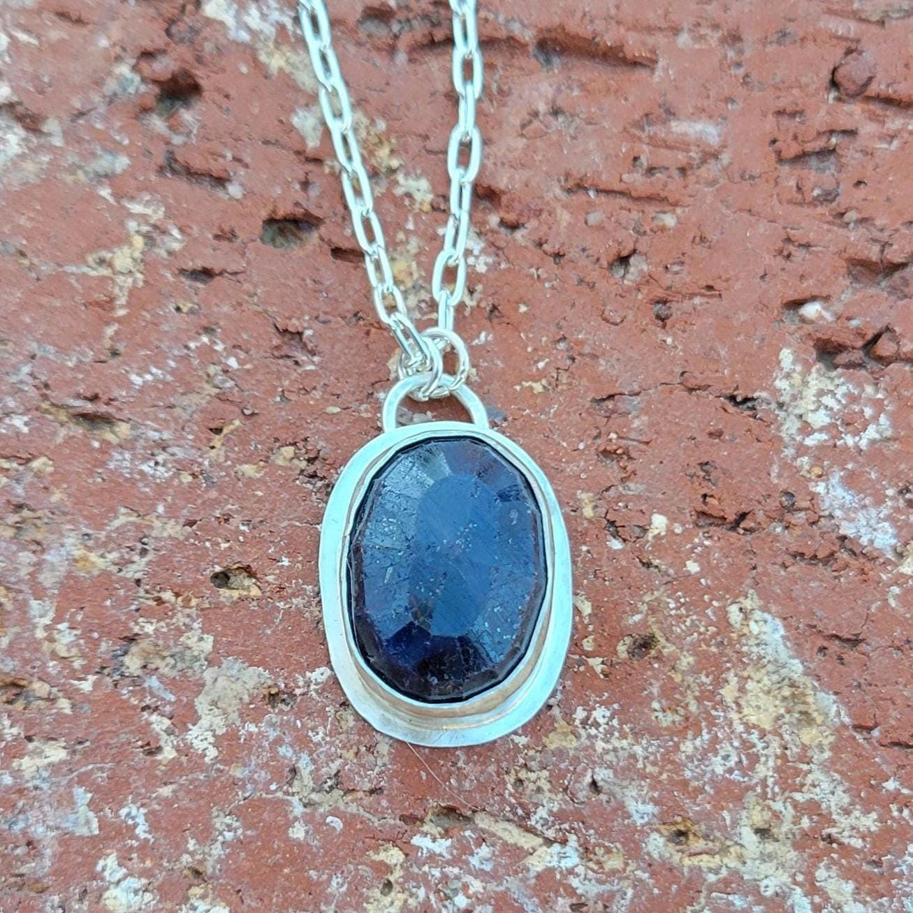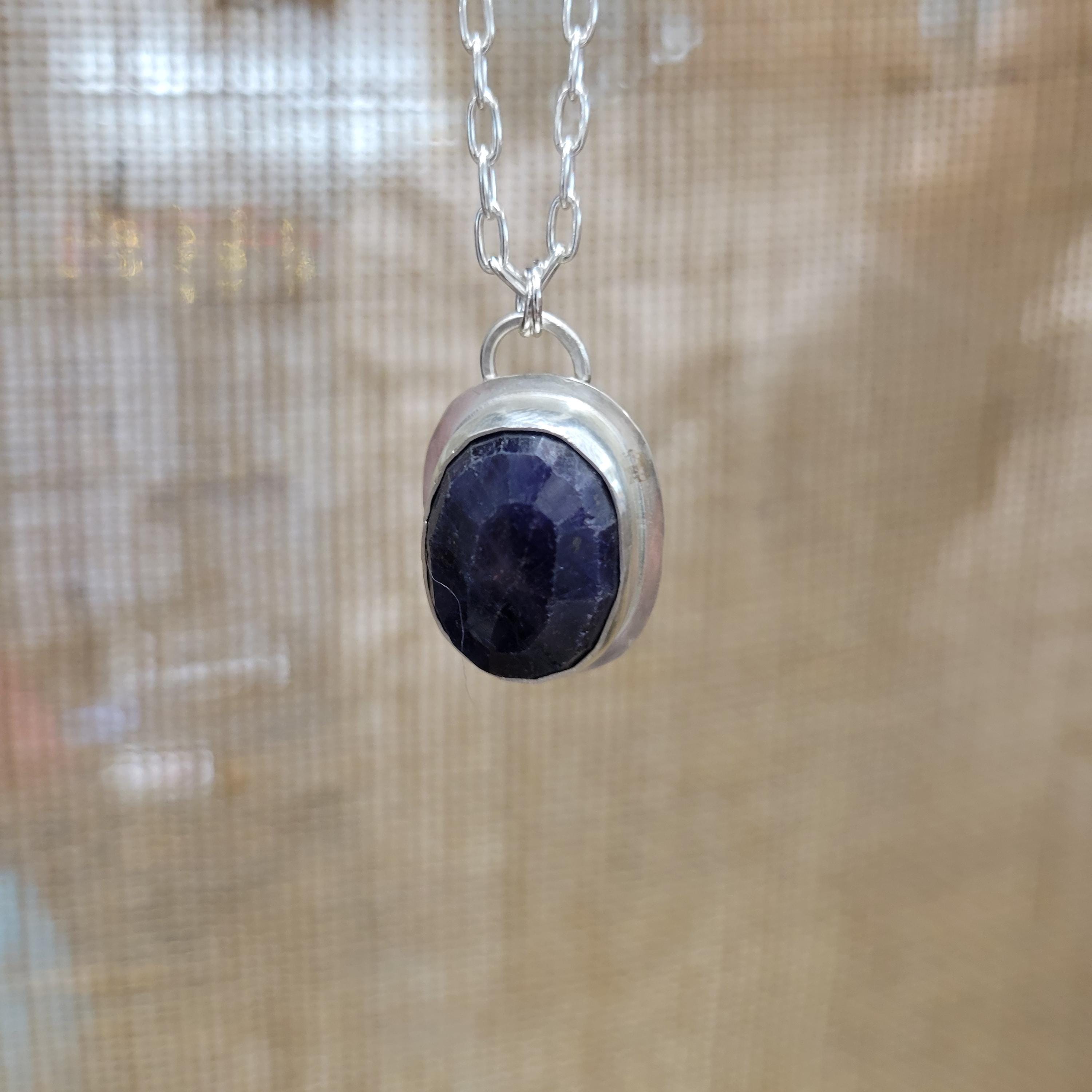Sapphire statement pendant with sterling silver setting, chain & handmade clasp.