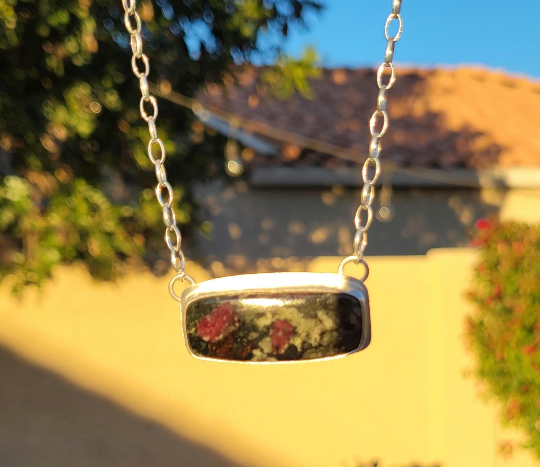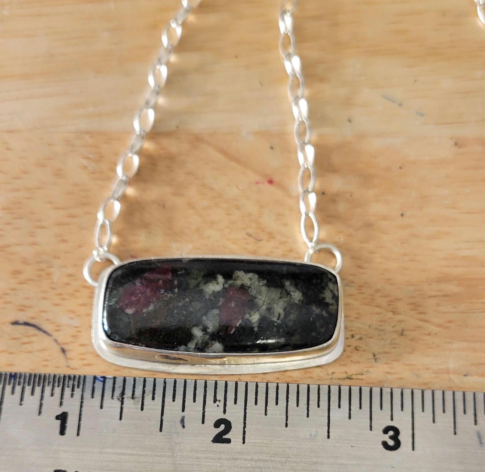 Large rectangular shape Eudialyte stone set with sterling silver setting, chain & handmade clasp.