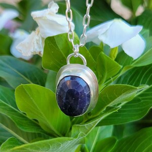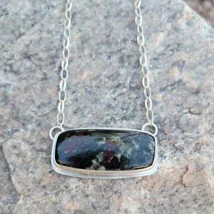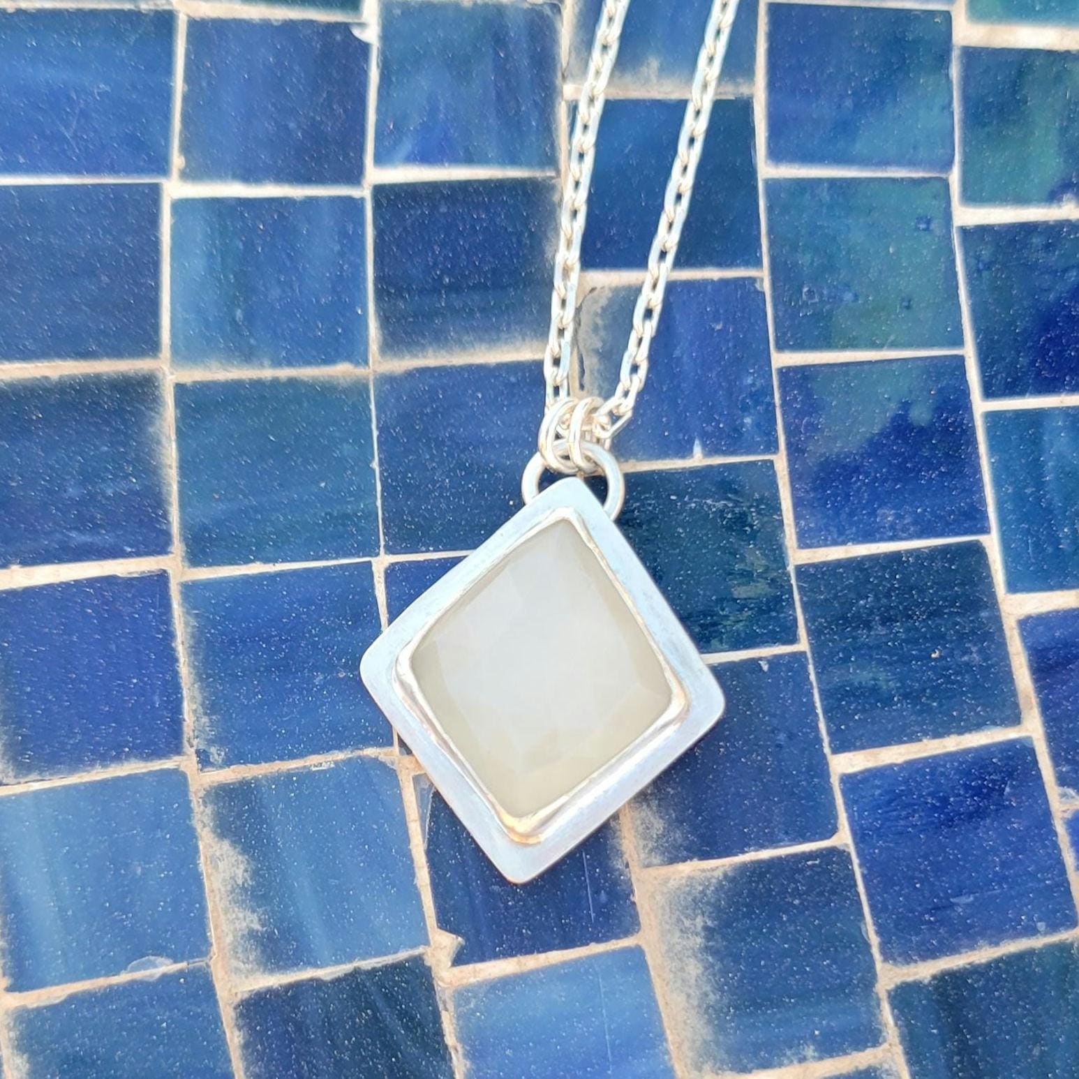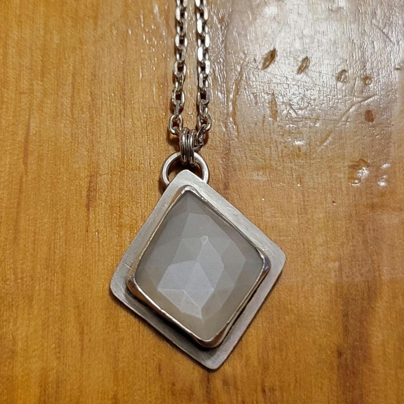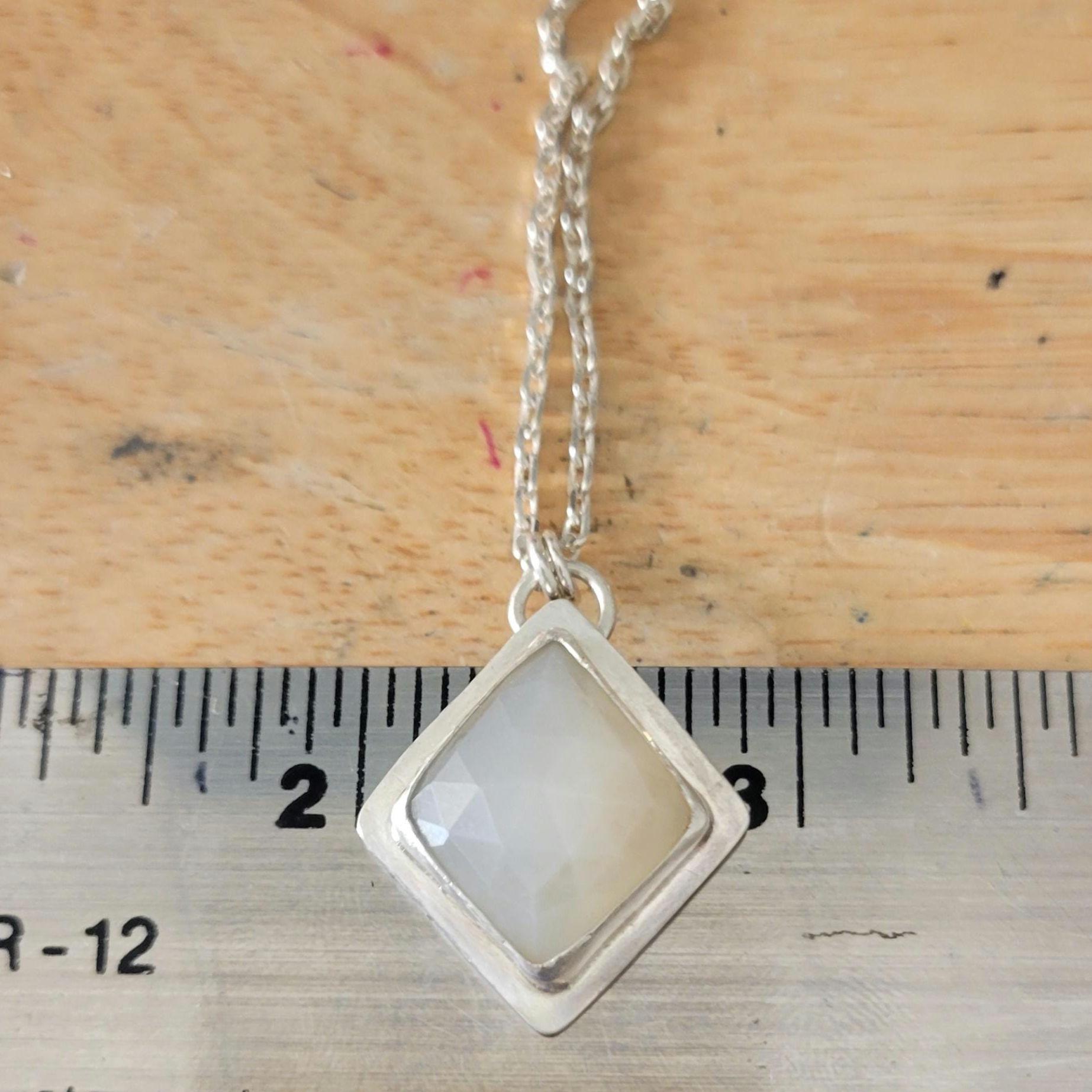 Moonstone diamond shape stone with sterling silver setting, 18" chain & handmade clasp.
