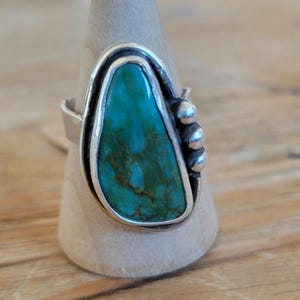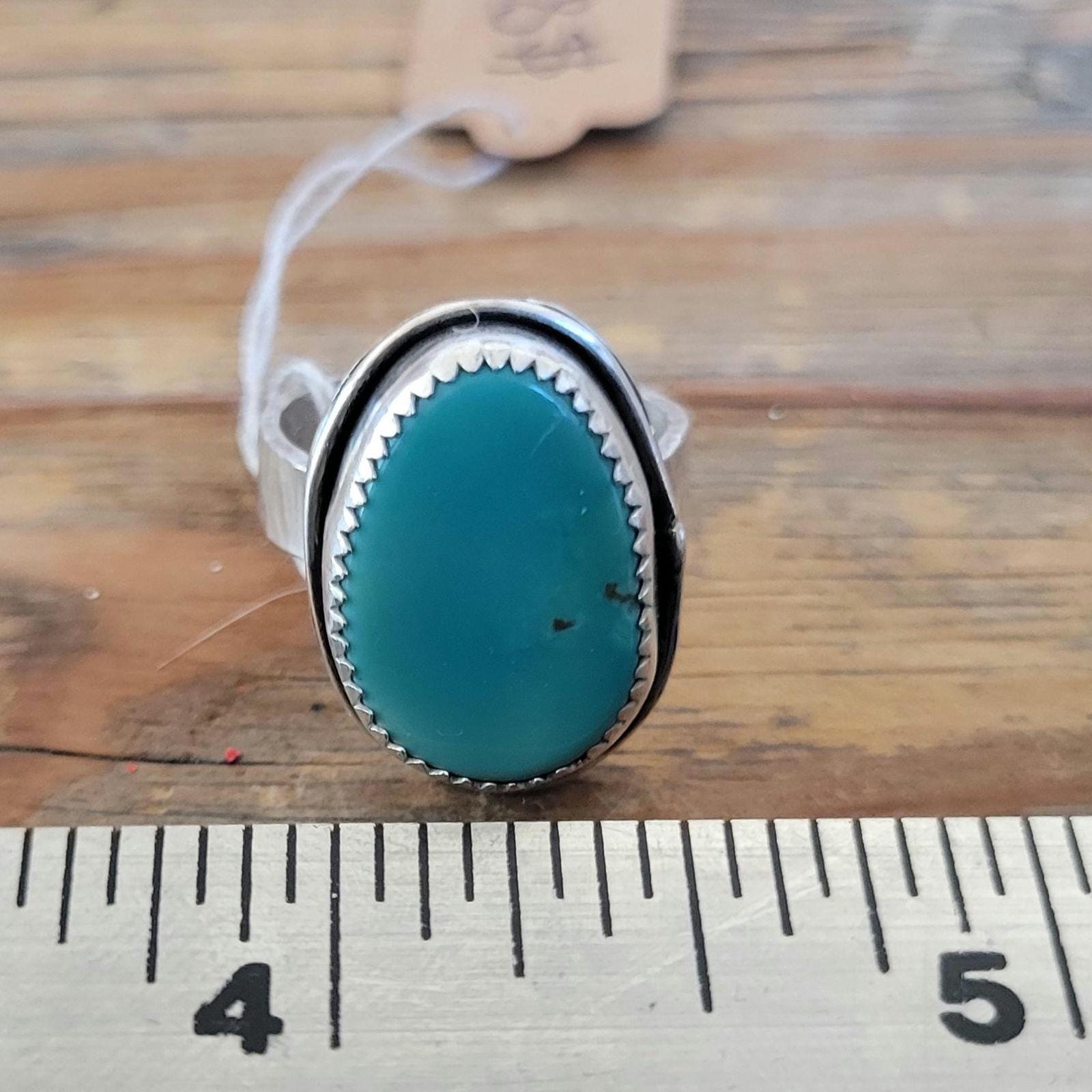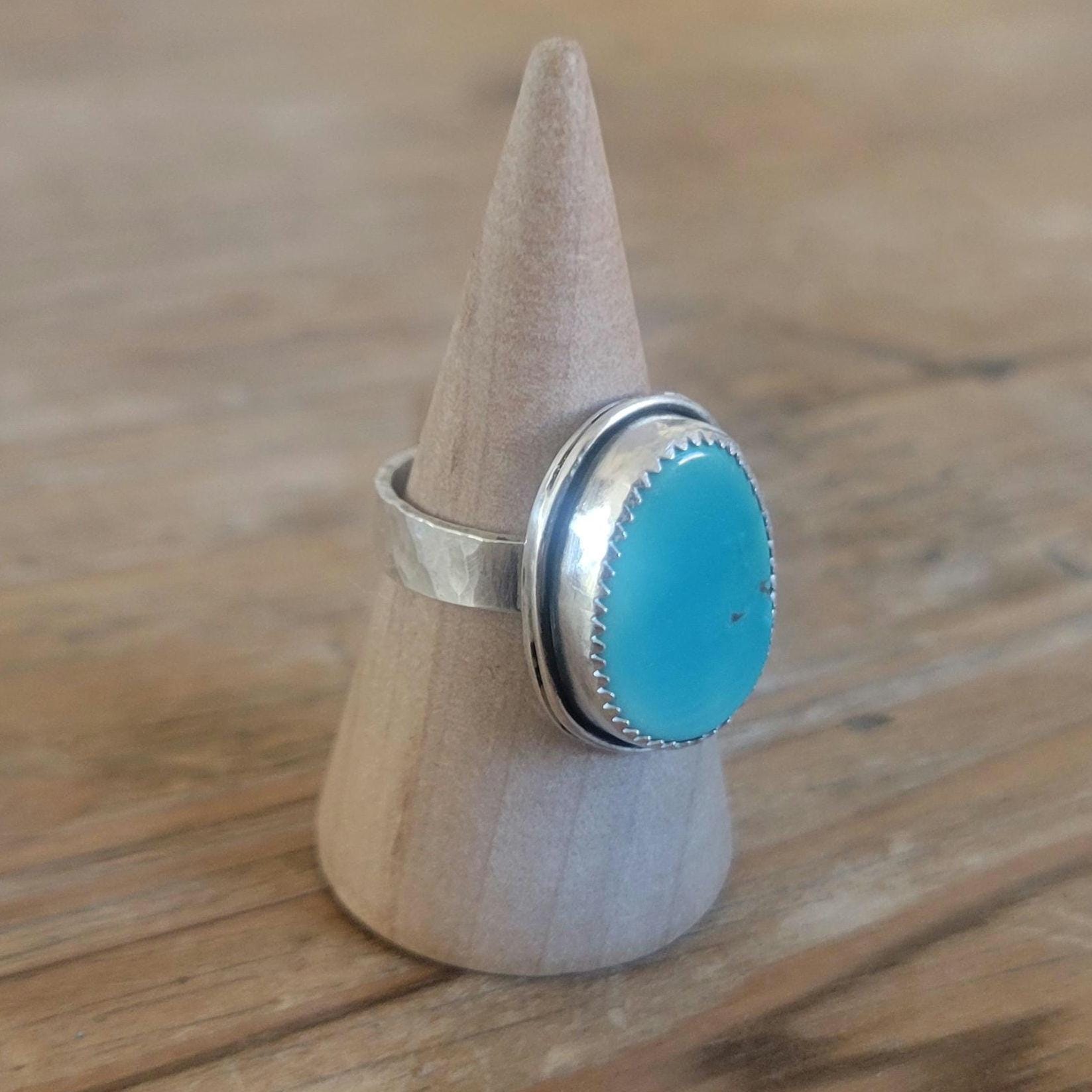 NV Mine Turquoise in sterling silver serrated edge bezel, setting & textured band.