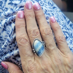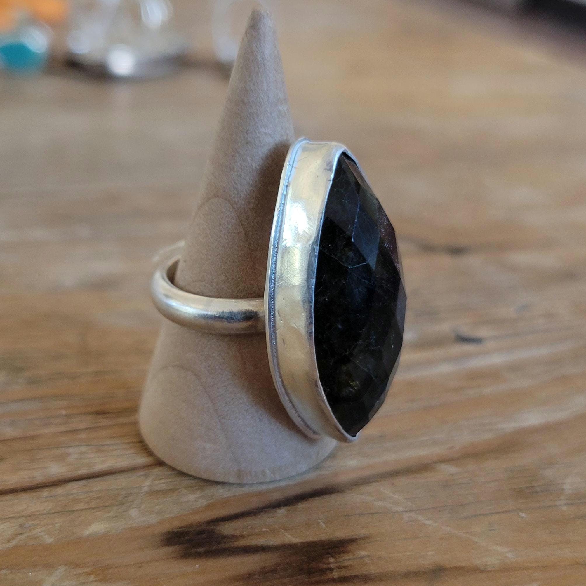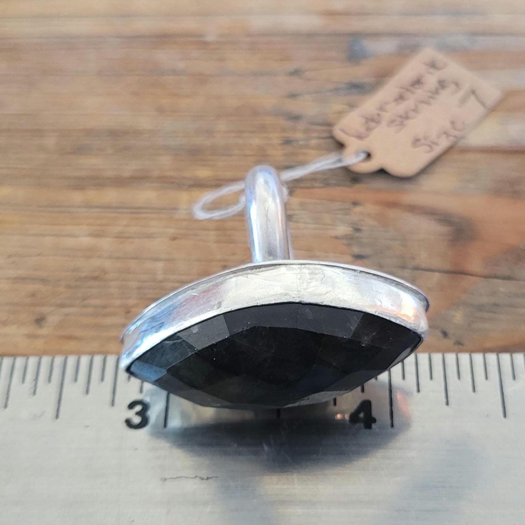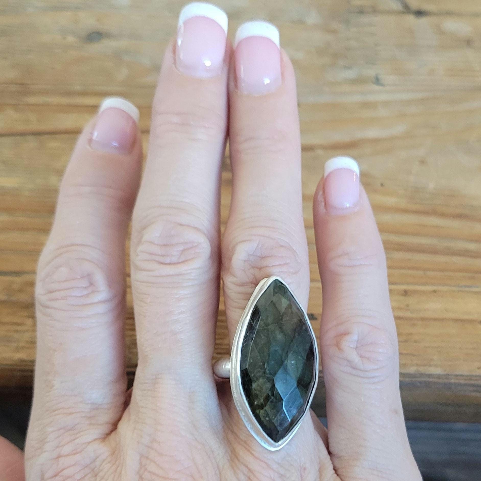 Large Marquise cut Labradorite stone with heavier setting and band. Band is sterling silver single half round 6g.