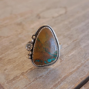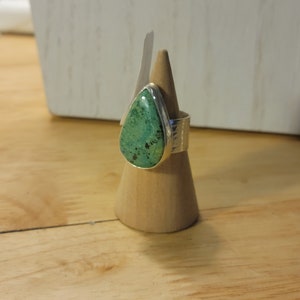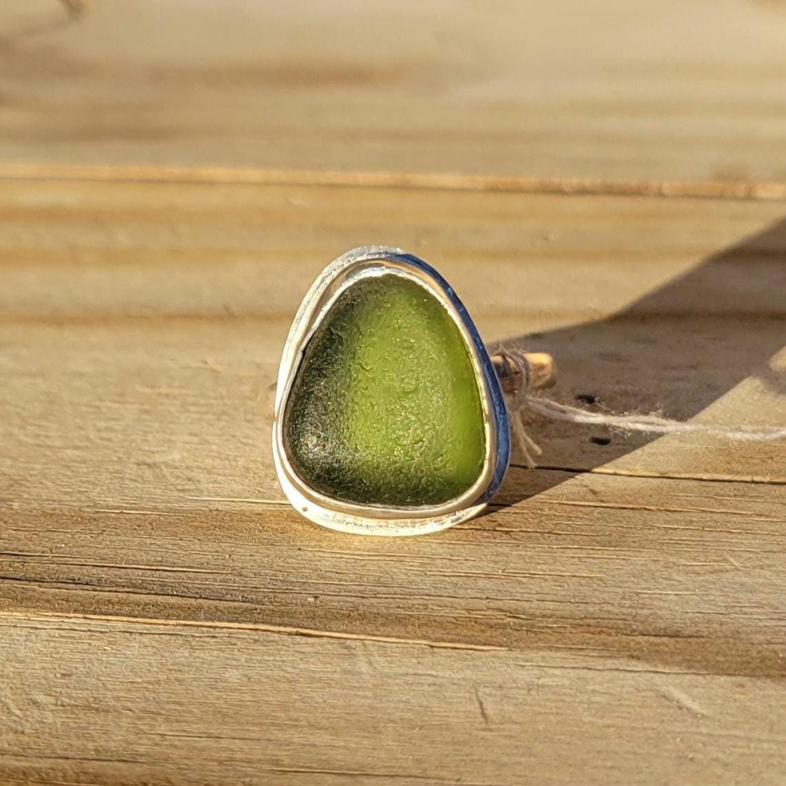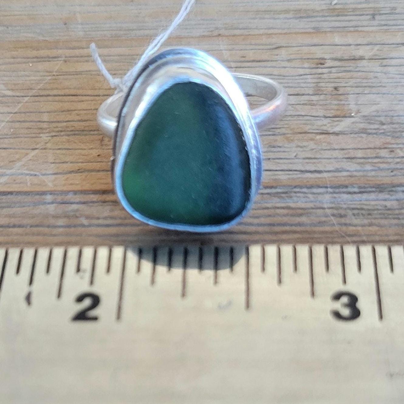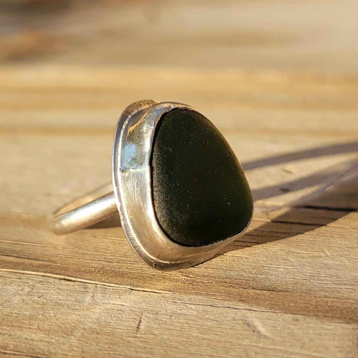 Dark green sea glass beachcombing treasure turned jewelry. Sea Glass with sterling silver setting & single half round 10g band.