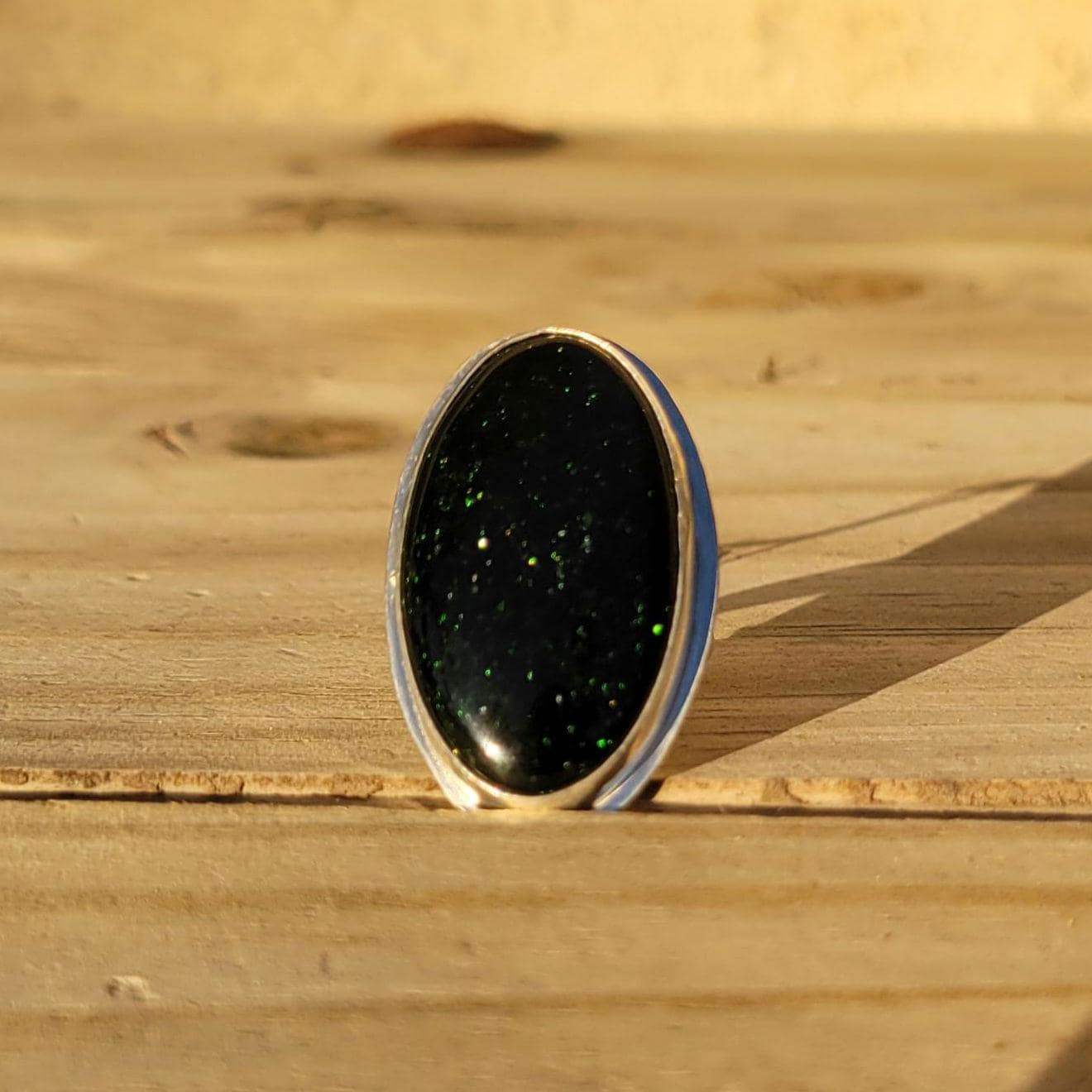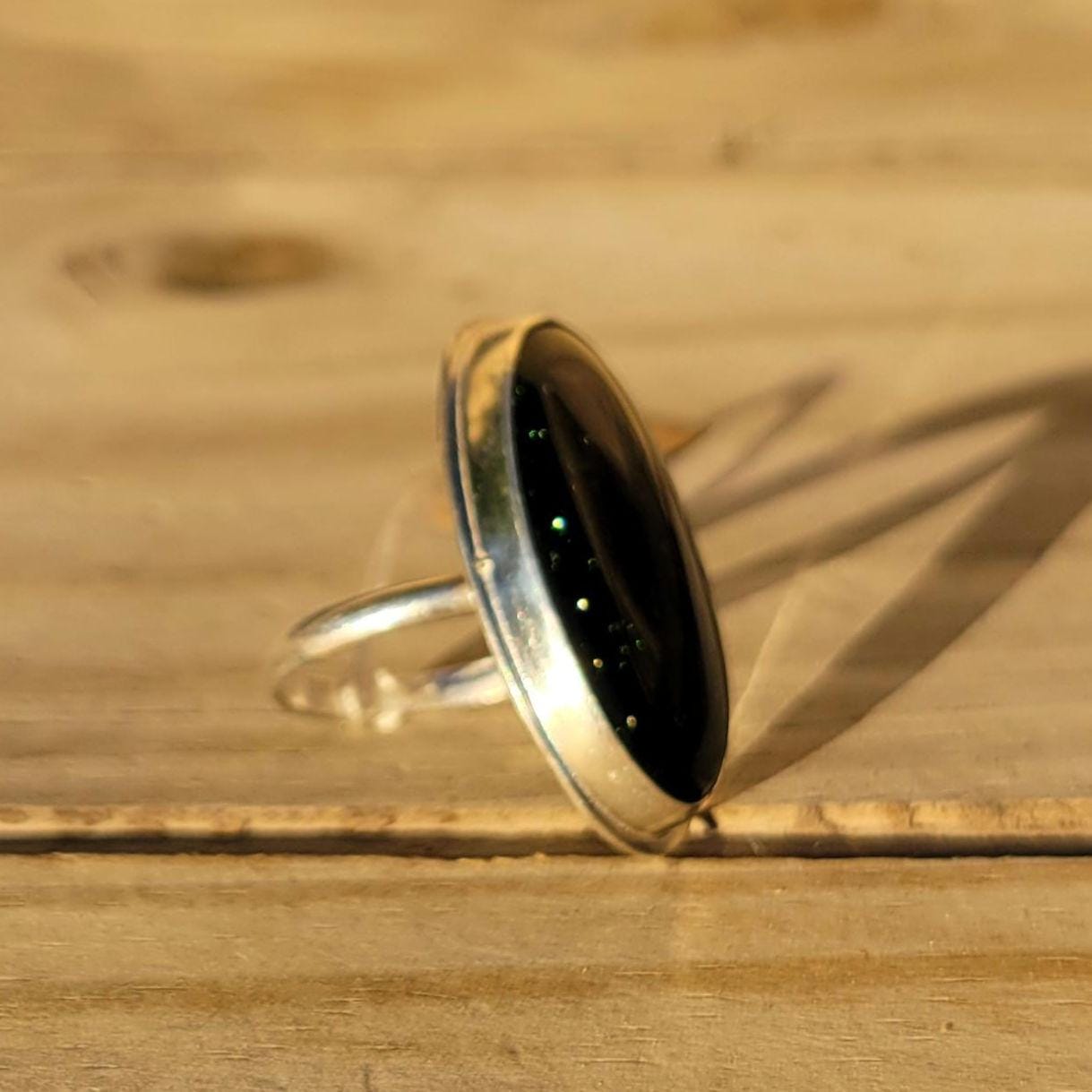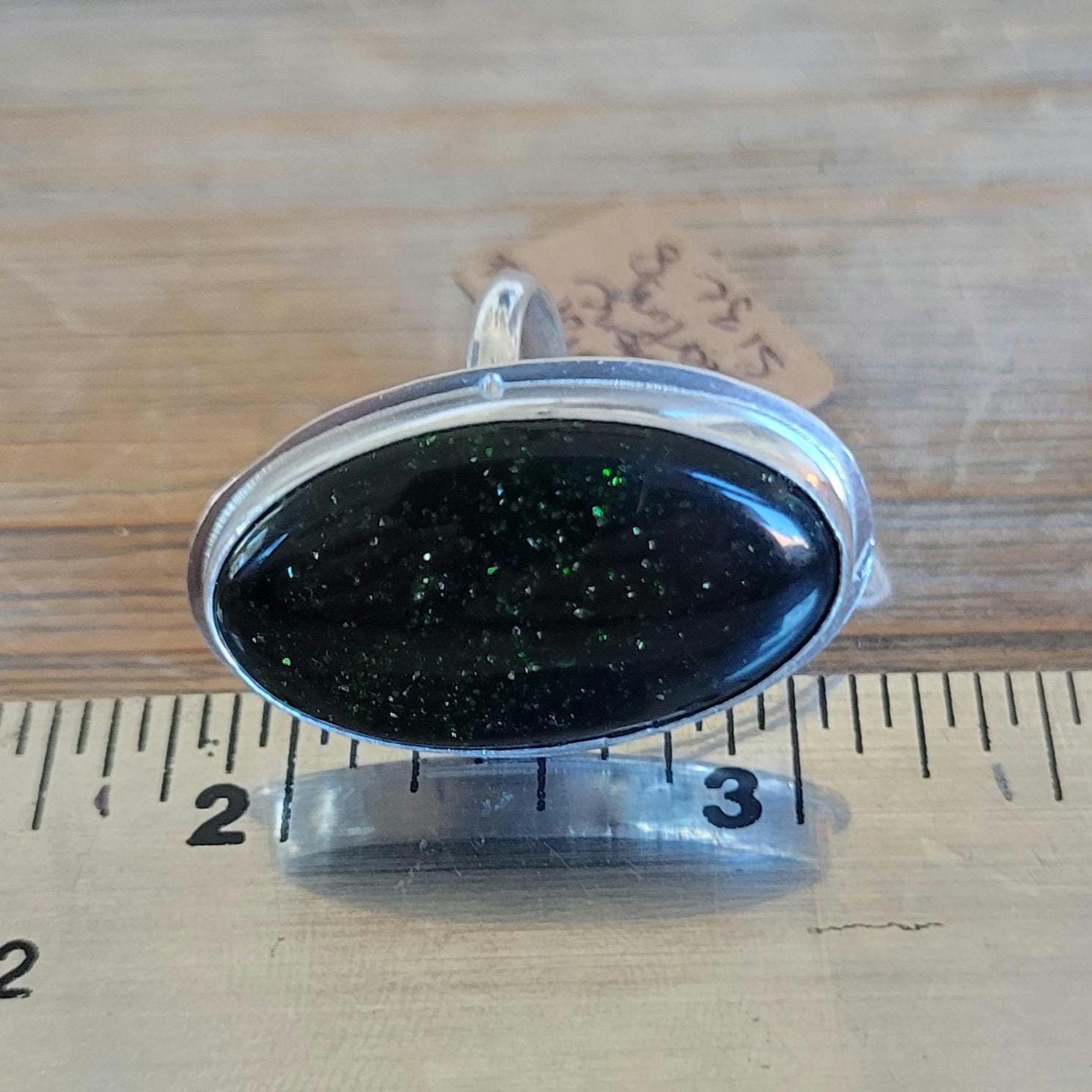 Fun green sparkly ring with sterling silver setting and single half round 10g size 8 band.